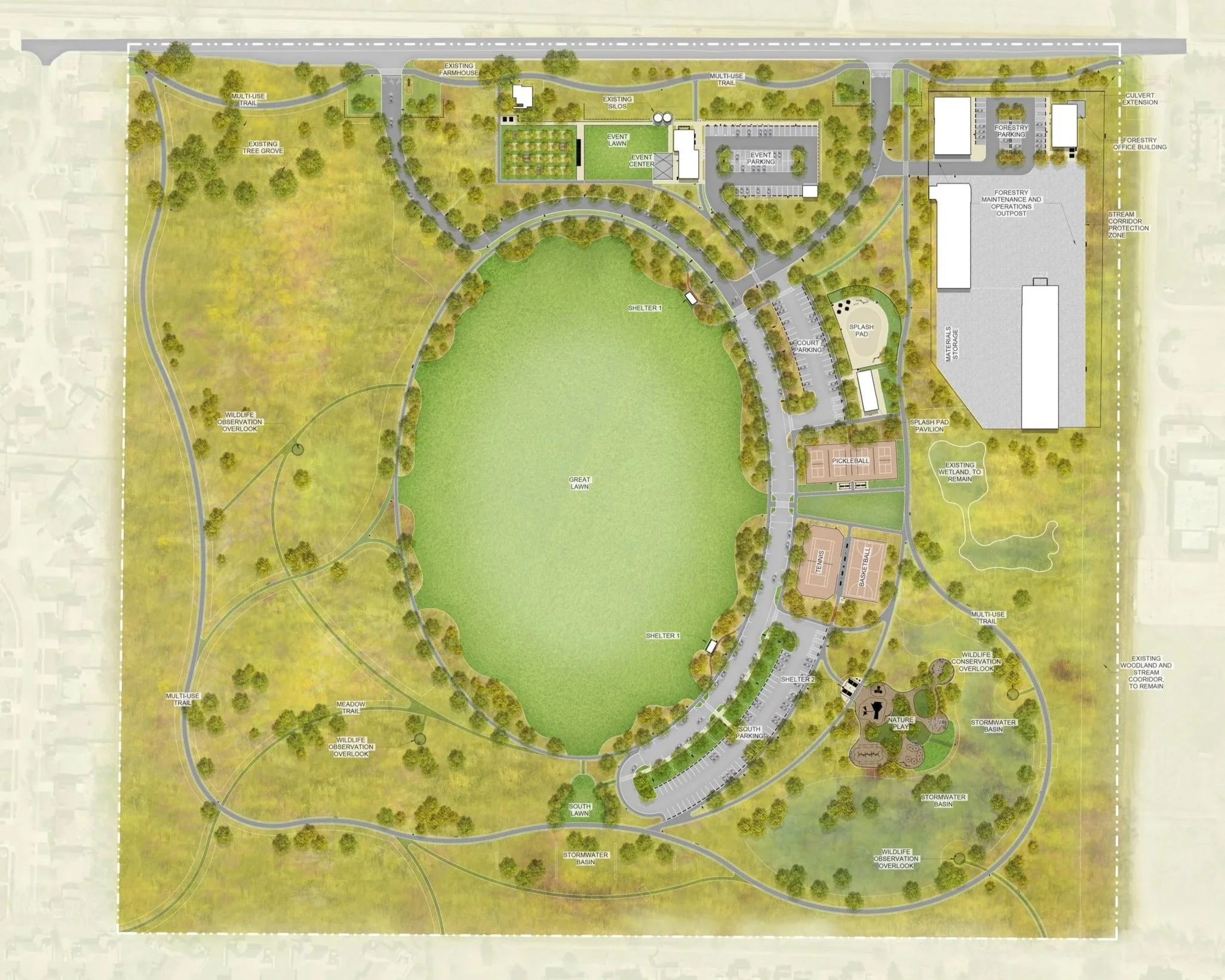 The Park Site Plan for West Case Park features an organic, meandering layout that reflects the site’s agricultural heritage. The design incorporates a primary entry drive from the west and a secondary entry drive from the east, creating a functional “front yard” and ensuring convenient access to the park’s wide range of amenities. This dual-entry system improves overall circulation by establishing a main entrance for park users and a secondary entrance for Forestry staff and overflow traffic. Planned improvements to West Case Road will further support safe, convenient access while maintaining efficient traffic flow within the public right-of-way.